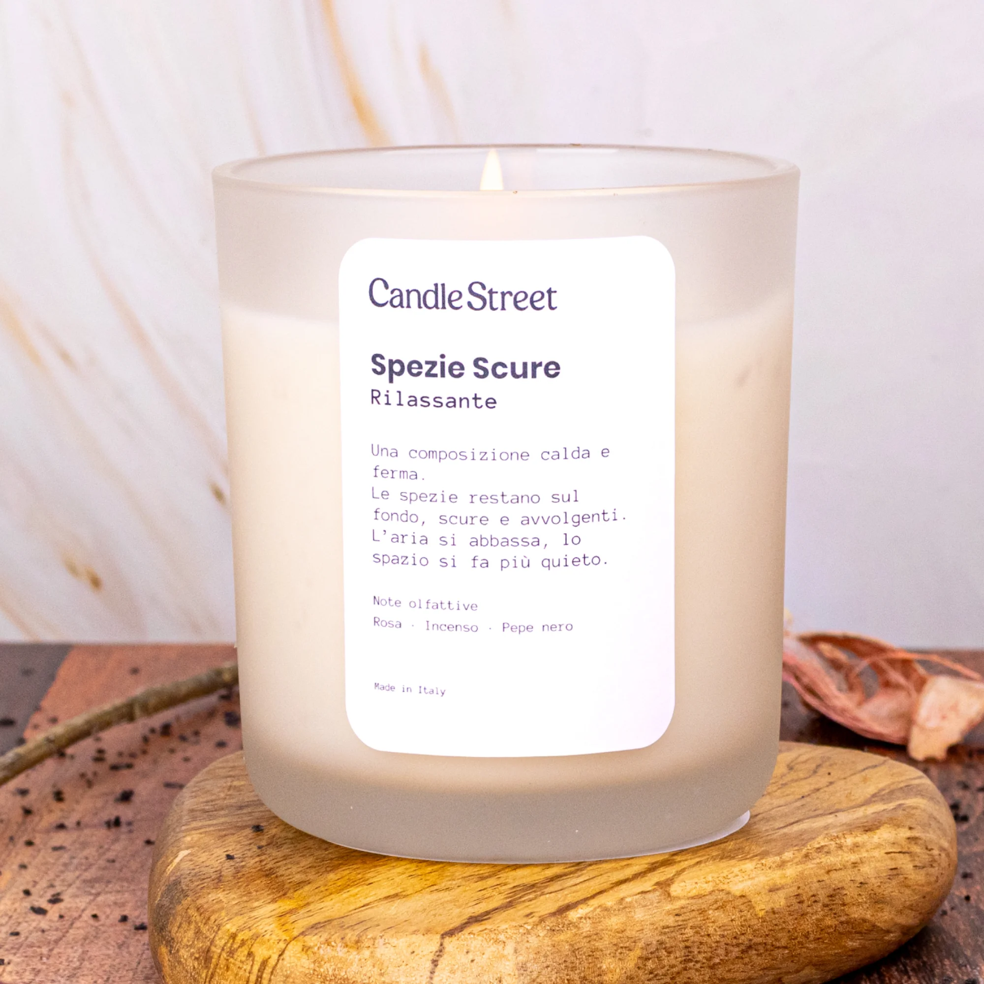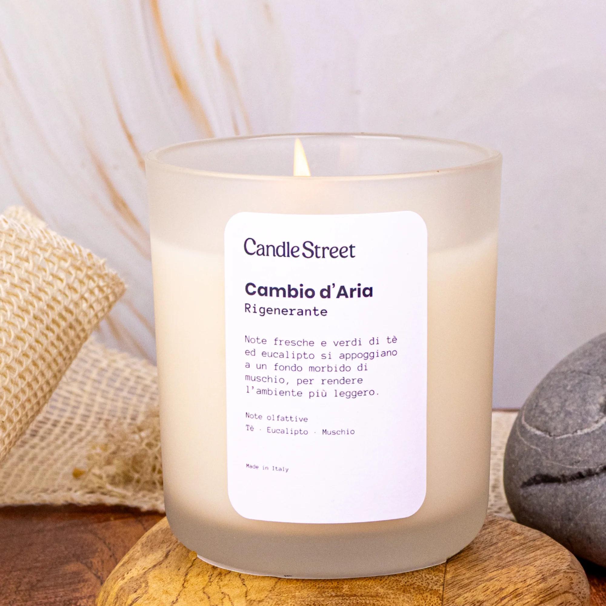 Una candela pensata per rinnovare lo spazio. Fresca ma non fredda, apre l’ambiente e lo rende più leggero, come quando si arieggia una stanza dopo una lunga giornata.